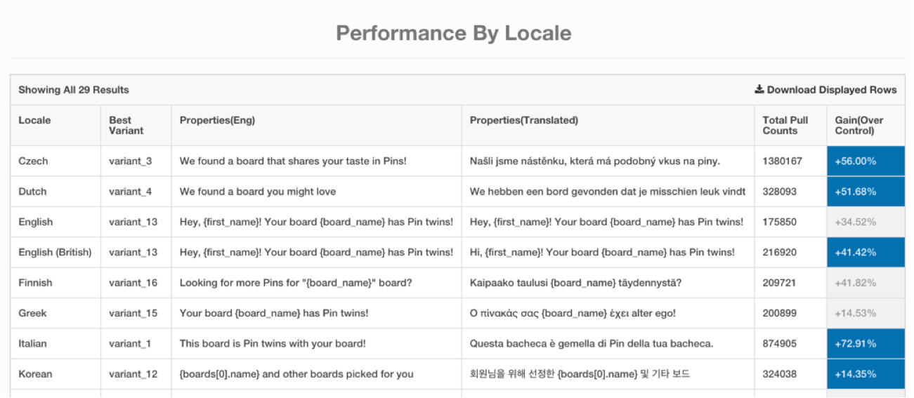 3) Have copy experiments auto-resolve themselves. When you’re running 30+ independent experiments (one experiment for each language), each with 15 different variants, it becomes too much analysis overhead to have a human go in and pick the winning variant for each language.