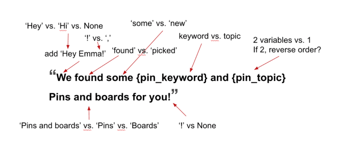 Let’s say that in Explore Phase, the winner was “We found some {pin_keyword} and {pin_topic} Pins and boards for you!”. There are many possible optimizations we can test in this example.